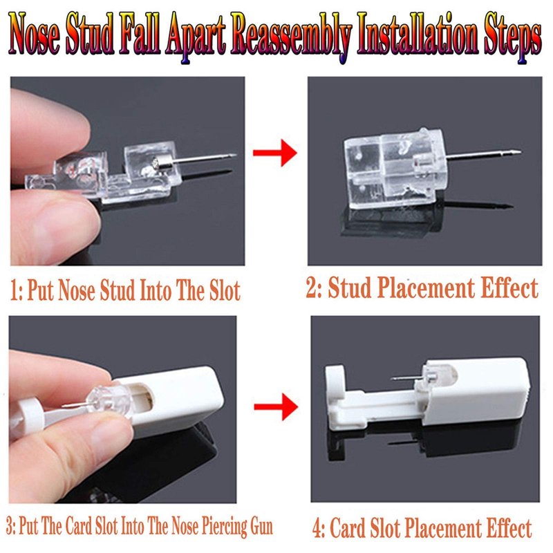 - Easy to use- You can even do the nose piercing yourself! As easy as using a Stapler, Hold the both ends of the piercing gun, align the tip of the ear stud with the mark and press firmly, Do not hesitate, Be sure to press it all the way down, hear a "click", and then release your hand, the needle tip will enter the nose plug, the nose plug will fall off naturally, and the puncture is completed. Or ask your family and friends to help with puncture, That would be very good.
