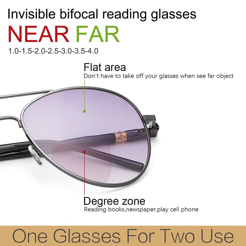 - Invisible Bifocal Aviator Reading Sunglasses - The Classic Avaitor Style Bifocal Reading Sunglasses has two visual areas. The top area is for distant vision. You can see the distance directly without having to remove your specs. The lower area is powered and convenient for reading indoors and outdoors. Perfect for outdoor reading and distance Viewing.