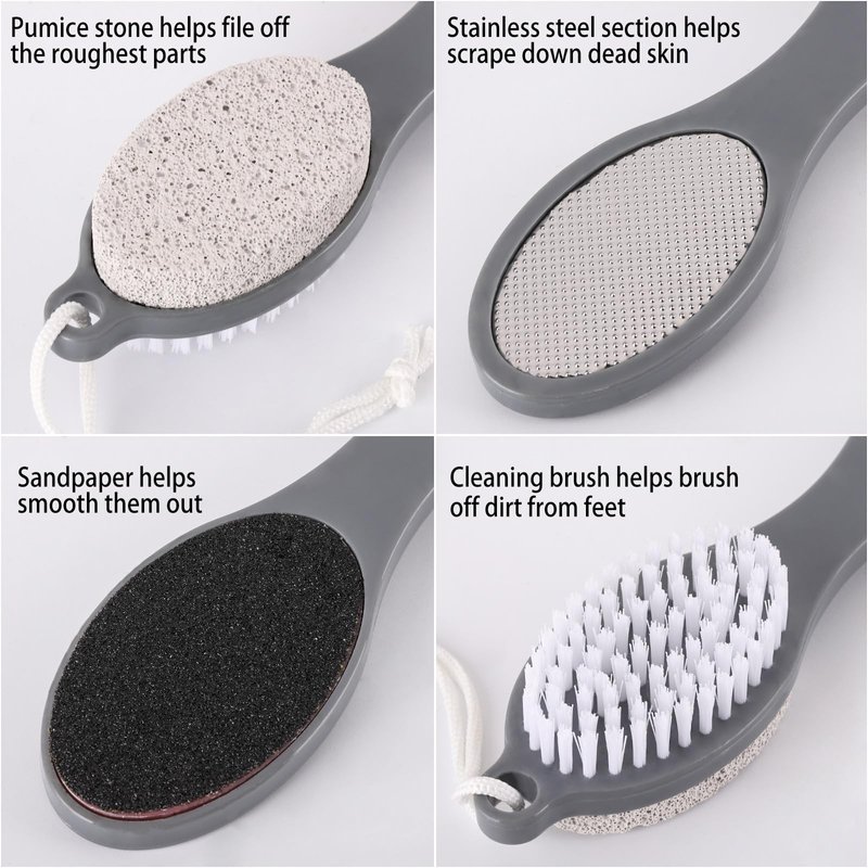 - All-in-one foot care tool, including stainless steel foot file, foot scrub brush, pumice stone and foot scraper. Pack of 2
