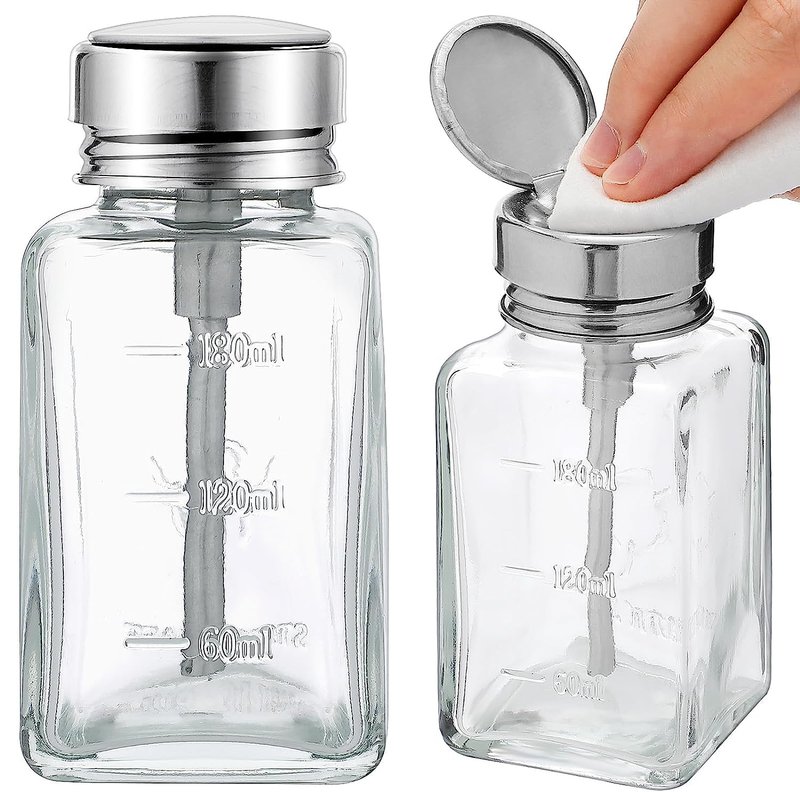 2 Pcs 6 Oz/ 180 ml Clear Pump Dispenser Bottle with Metal Flip Cover Glass Nail Polish Remover Push Down Dispenser Bottle Refillable Push Down Pump Dispenser Press Container for Makeup Remover
