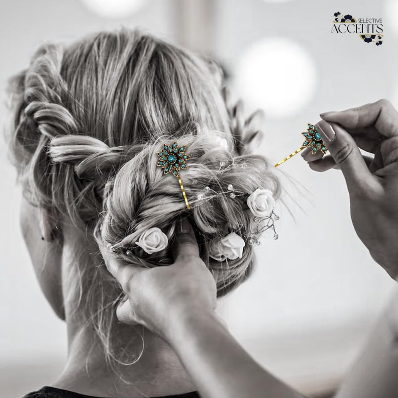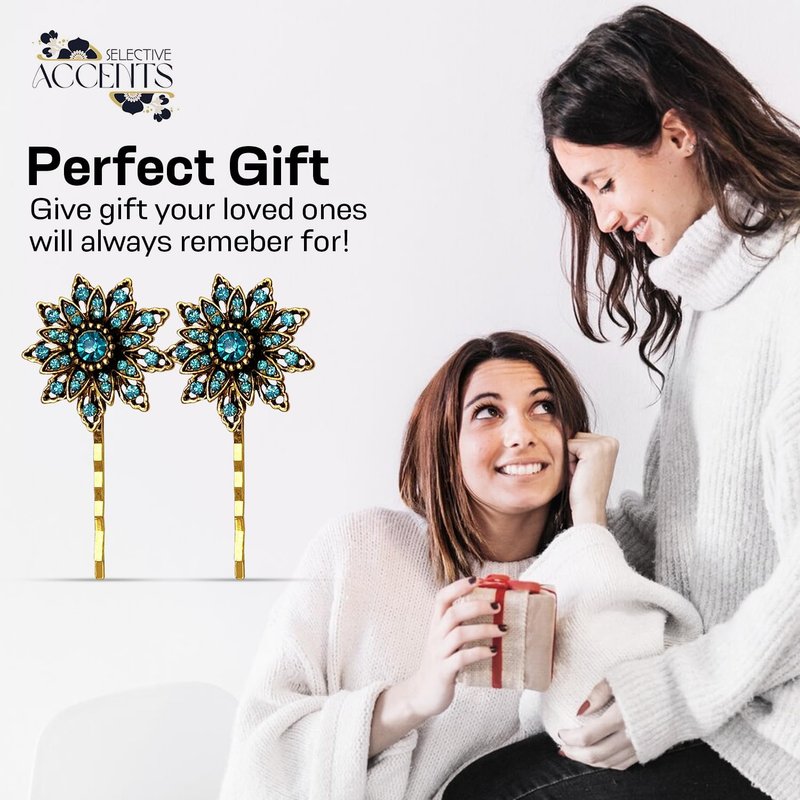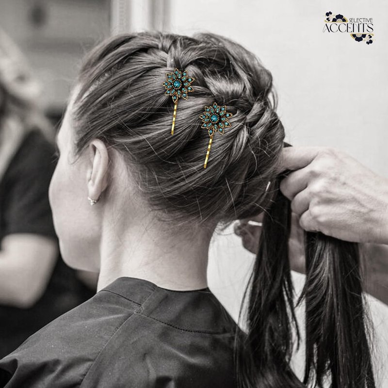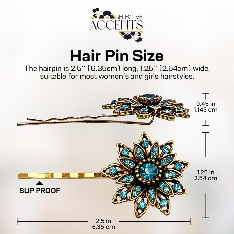 This set of Retro inspired hair pins are perfect for anyone looking for a vintage chic look! The “Ava” hair pin set is perfect for a formal event or for every day wear. Wether you have short or long locks these pins are versatile for all hair types. Perfect for accenting updos or holding back beautiful side pieces with glamrous chic style. French floral inspired, our pins feature many faceted sparkling dreamy blue glossy stones set in lustrously detailed golden antiqued floral base. This classic hair pin features exquisitely crafted details that make it timelessly elegant. Each and all of our devine beauties are hand crafted and soldered with extreme precision and detail and with the highest quality gems and metals to produce the absolute most unique and durable pieces possible for you to enjoy for years to come! 2 1/4 inches in length Your new purchase(s) will swiftly arrive beautifully packaged for gift giving options. This listing is for one set of two hair pins. The "Ava" pin is designed and produced by Selective Accents LLC and is protected under US copyright law. All Rights Reserved Selective Accents LLC