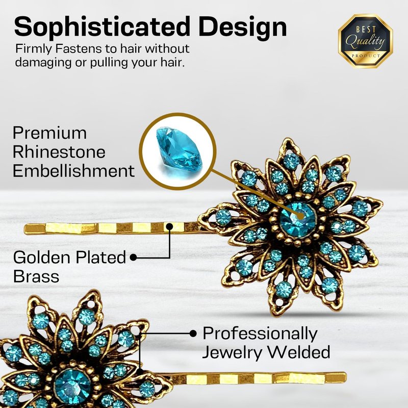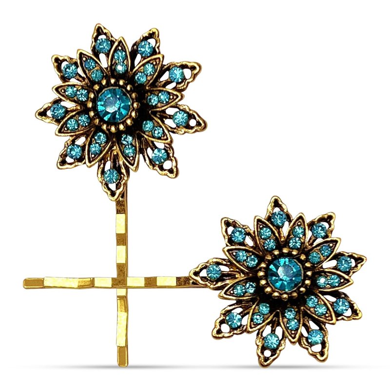 - French floral inspired, our pin features many faceted sparkling dreamy blue glossy stones set in lustrously detailed golden antiqued floral base. This classic hair pin features exquisitely crafted details that make it timelessly elegant.