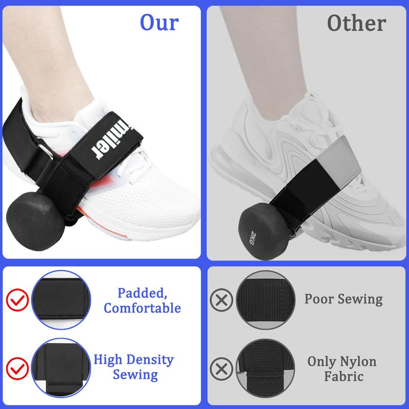 - Durable and Comfortable Design: The tibialis strap made with high-density nylon webbing and reinforced stitching, this ankle exercise strap can hold weights up to 150 lbs. Its premium neoprene padding ensures comfort, even during barefoot workouts, making it both sturdy and comfortable for various weighted leg exercises.