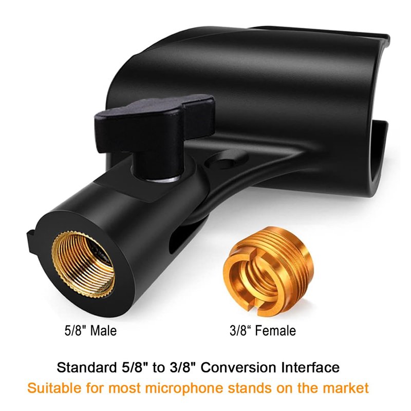 - Universal microphone clip holder come with 5/8" male to 3/8" female metallic screw adapter.Suitable for most handheld microphone and mic stand on the market.
