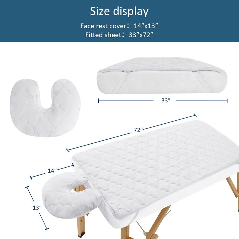 - Fits standard tables: Our 2 piece Massage Table Sheet set Includes a 72" x 33" flat pad and 14" x 13" x 5" face cradle cover fit most massage tables with rounded or squared corners. The elastic bands slip on easily and stays in place. Elasticized headrest cover fits most standard massage table crescent shaped face cradle pillows.