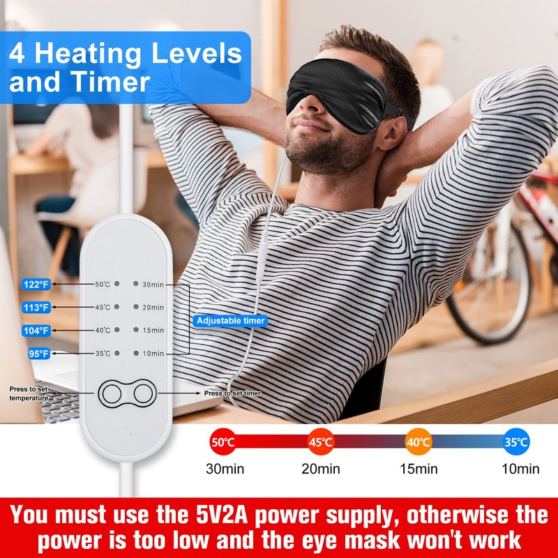- What you get: you will get 2 pieces of silk heated eye masks and 2 pieces of USB cables, the soothing warmth helps you go into a deep sleep at home, take a rest for eyes at the office, enjoy yourself on travel and have an eye spa in the hotel; Warm note: the eye mask is compatible with a 5V2A power supply, otherwise it might not work