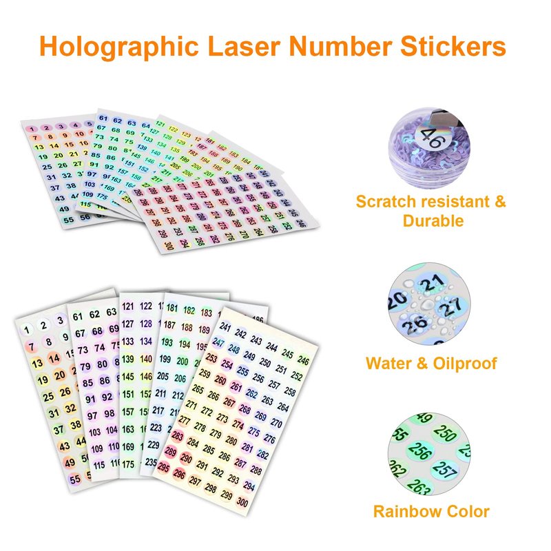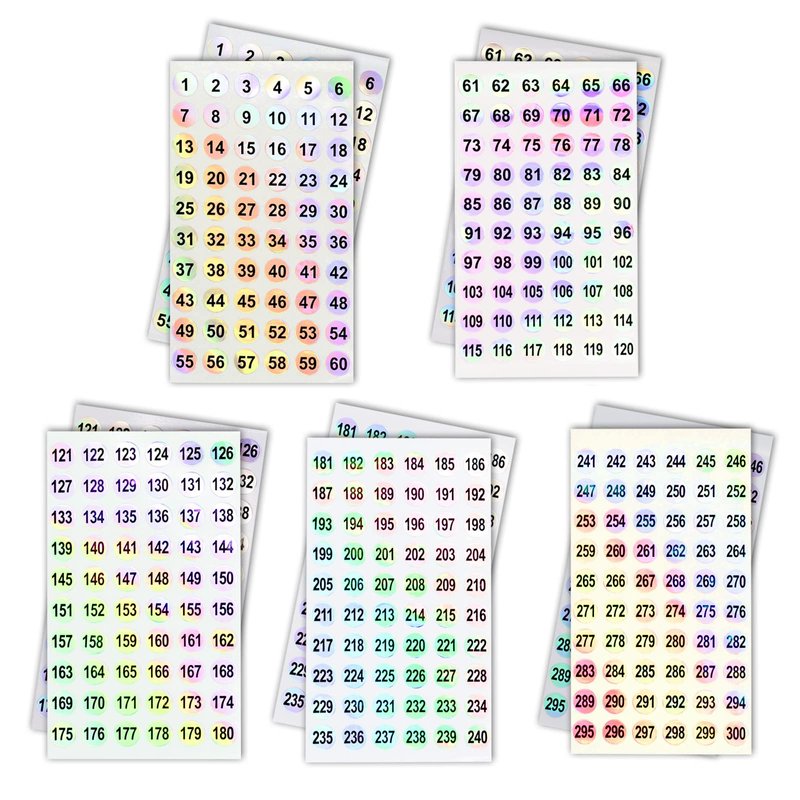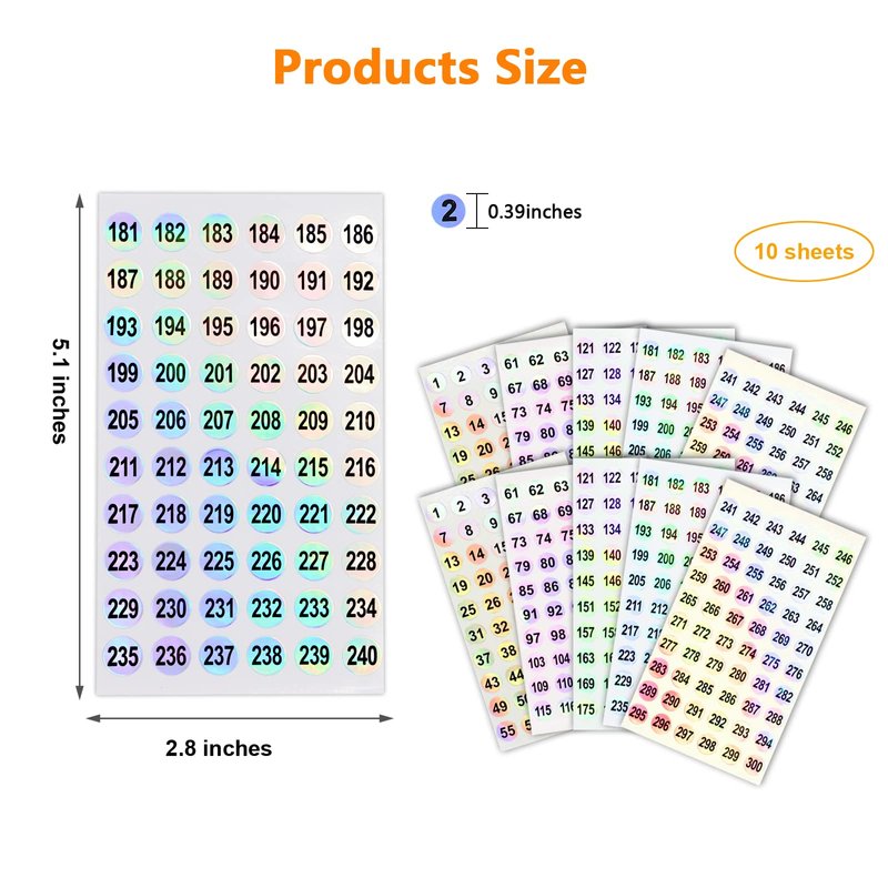 - šćPackage Includeć2 sets number stickers(from 1 to 300), total 10 sheets, 60 stickers in each sheet.The round number tags diameter is 10mm/0.39".