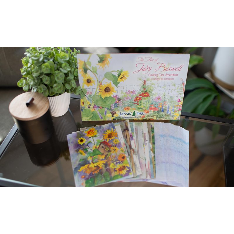 Introducing Leanin' Tree's Art of Judy Buswell's Greeting Cards Assortment Box. These beautifully designed watercolor cards with envelopes include 20 all occasion cards assortment box with envelopes. Whether it's a happy birthday card, a sympathy card, a get well soon card, or simply blank cards and envelopes to express your feelings, this Greeting Cards Assortment Box has got you covered. The set also includes 22 colorfully designed envelopes to add an extra touch to your messages. This All Occasion Cards Assortment Box with Envelopes Includes: 8 Birthday Cards, 1 Anniversary Card, 3 Blank Cards, 1 Encouragement Card, 2 Friendship Cards, 2 Get Well Cards, 1 Sympathy Card, 1 Thank You Card, and 1 Wedding Card so this greeting card assortment will ensure that you are always prepared to send out your best wishes throughout the entire year. Send blank cards and envelopes and craft your own personalized messages inside them to express yourself to loved ones. These artistic watercolor cards with envelopes have stunning floral designs by world renowned artist, Judy Buswell and they are sure to add a sophisticated flair to your blank note cards and greeting cards. Each card is printed on recycled paper using soy-based inks, a testament to Leanin' Tree's commitment to sustainable practices. The colorful interiors of the cards, along with the colorfully designed envelopes, make your messages stand out, whether you are giving heartfelt sympathy cards or happy birthday cards. This assortment isn't just about quality, but also convenience. The box doubles as a greeting card organizer, keeping your cards neat and ready for any occasion. And the best part? This entire set is made in the USA, promising premium quality and supporting local businesses. Whether you're in need of a friend's birthday card, a condolences card, or a simple thank you card, this all occasion cards assortment box with envelopes will have you covered. It's not just a box of cards; it's a box of emotions, ready to be shared. So why wait? Add this beautifully designed greeting card assortment box your collection today.