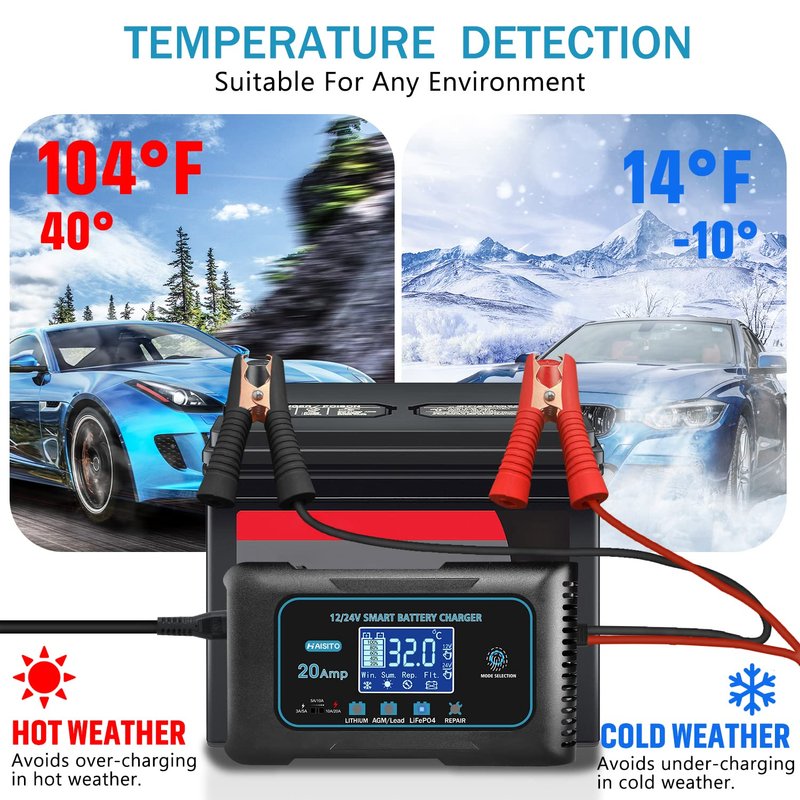 Meet the Haisito P20, one of our most powerful, highest-performing, energy-efficient, and compact portable universal battery chargers yet. The Haisito P20 is a 20-amp - 100-240VAC 50-60Hz - 12-volt and 24-volt heavy-duty battery charger, battery maintainer, trickle charger, float charger, and battery desulfator for up to 30 amp-hours. It's designed to charge and maintain all types of sealed lead-acid and lithium-ion (lifepo4) batteries, including flooded, gel, maintenance-free, AGM, SLA, VRLA, as well as automotive, marine, RV, powersports, and deep-cycle batteries. Its advanced battery repair regenerator mode uses slow pulse reconditioner technology to automatically detect battery sulfation and acid stratification, restoring lost battery performance for extended battery life. It can be used and stored almost anywhere - home, garage, mobile, bench, or in car - to charge and maintain any battery - even plug in through your vehicle's 12V auxiliary cigarette lighter port. Its next-generation charging regime utilizes fast charging microprocessor technology to rapidly recharge batteries without any manual intervention. It's a completely automatic, worry-free, professional, and commercial-grade intelligent battery charger with zero overcharge. Designed to be dual purpose - both indoors and outdoors - providing weatherproof and waterproof protection from the outside elements during any time of the year, including winter. Its X-Connect battery connectors - better than SAE - allow for quick-connect permanent connection or connecting directly to the battery terminals. A digital display provides the charging status and tests diagnostics for multiple conditions such as a dead battery, bad battery, reverse polarity, and more. And it's compatible with all types of gas and diesel vehicles, including cars, automobiles, motorcycles, dirt bikes, scooters, mopeds, lawn mowers, ATVs, UTVs, lawn tractors, trailers, trucks, SUVs, boats, campers, RVs, jet skis, PWCs, wave runners, snowmobiles, 4-wheelers, generators, golf carts, classic cars, including BMW, Mercedes-Benz, Porsche, Bentley, Maserati, Lexus, VW, Audi, Ford, Chevrolet, Corvette, Cadillac, Jeep, Prius, Toyota, Subaru, Nissan, Honda, Harley-Davidson, Suzuki, Yamaha, Kawasaki, Ducati, KTM, Indian, Husqvarna, Vespa, Polaris, Seadoo, John Deere and more.