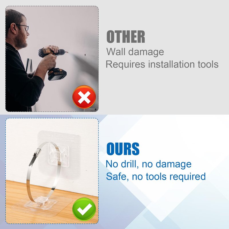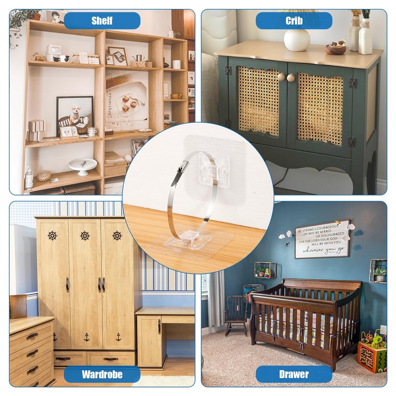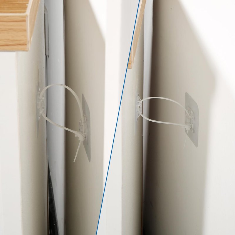 - Easy to Install: No drilling, screws or tools required. Just make sure the installation location is clean before installation. First peel off the protective film behind the furniture anchor, then stick it in the corresponding place, and finally tie it with nylon tape. It will not leave stains when removed.