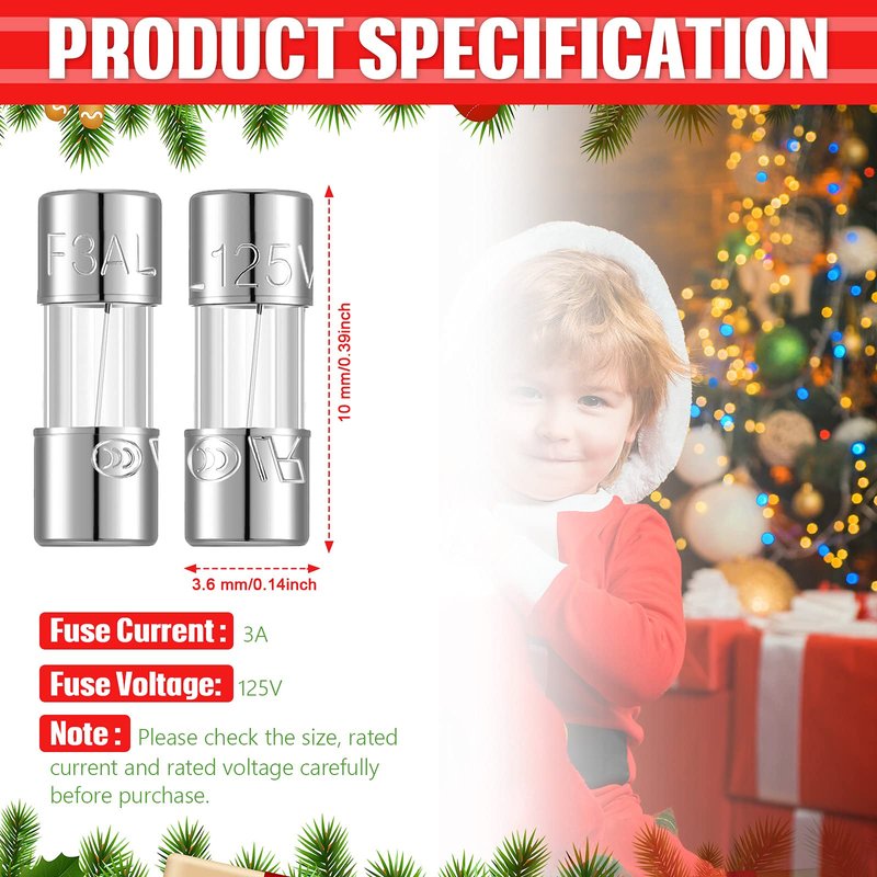 - Size details: the size of Christmas lights fuse replacement is about 0.14 x 0.39 inch in diameter and length, 125 Volt, glass fuse model features a max rating of 3 Amp, please check the details carefully before buyingSize details: the size of Christmas lights fuse replacement is about 0.14 x 0.39 inch in diameter and length, 125 Volt, glass fuse model features a max rating of 3 Amp, please check the details carefully before buying