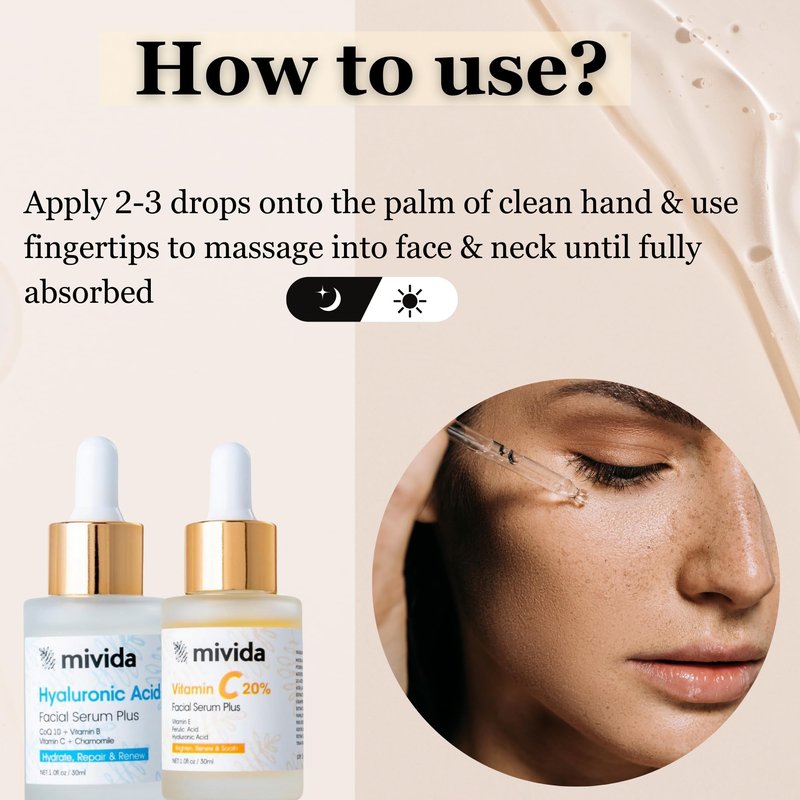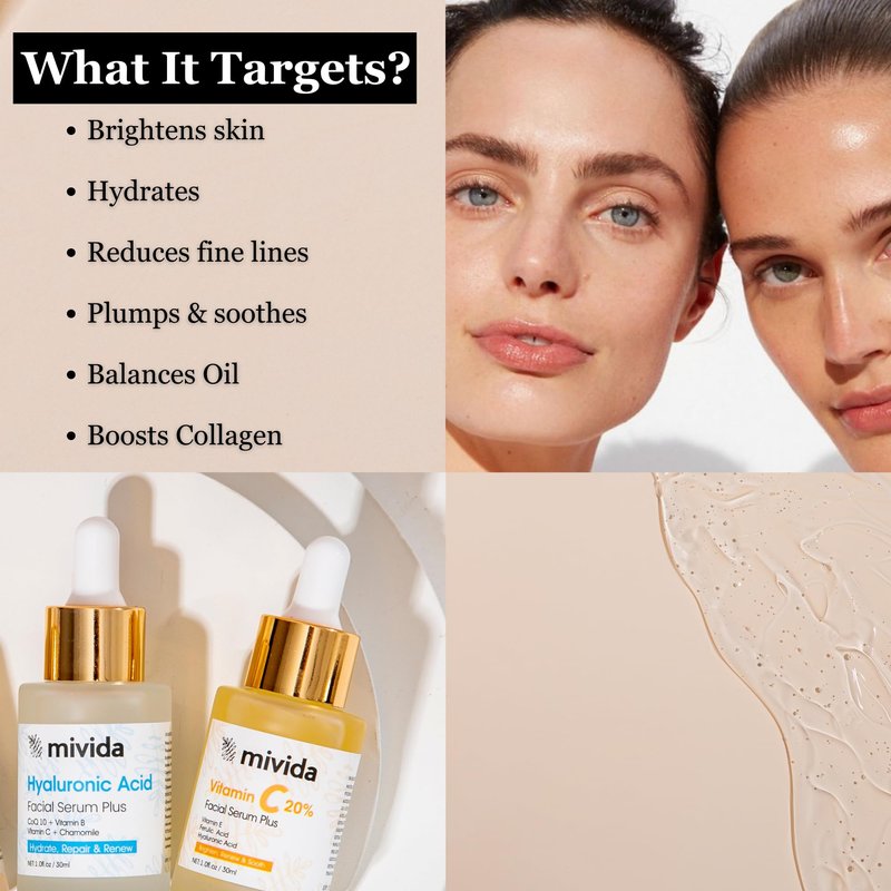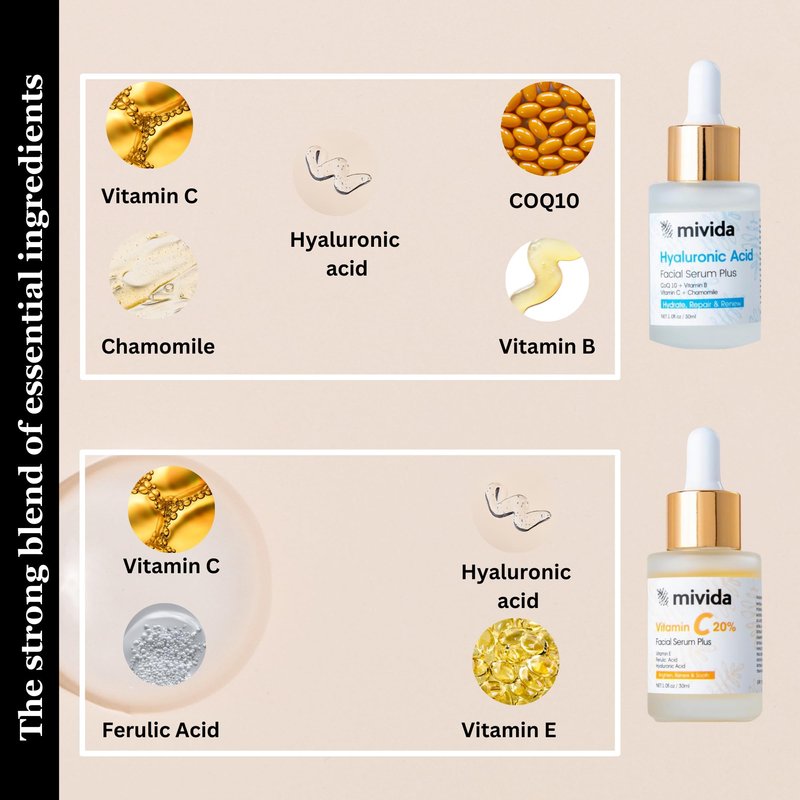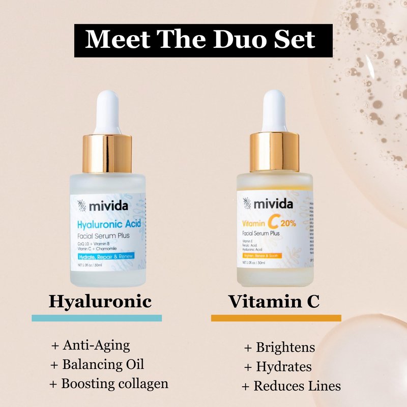 - Experience the potent blend of Vitamin C and Hyaluronic Acid in our Mivida Vitamin C Facial Serum. This luxurious serum deeply hydrates and moisturizes your skin, effectively reducing the appearance of fine lines and wrinkles while imparting a soothing sensation and a plumping effect.