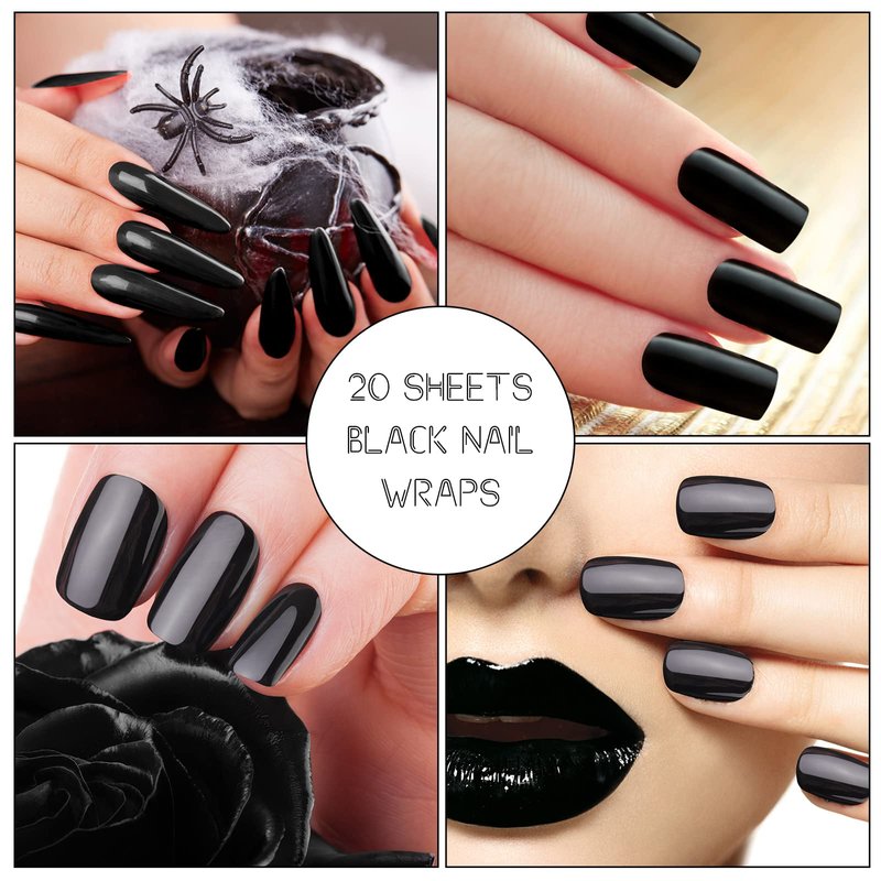 20 Sheets 280 Pieces Black Nail Wraps Self Adhesive Full Cover Nail Decals Art Nail Polish Stickers Halloween False Nail Decals Manicure Stickers with 2 Pcs Nail Files for Girls Women(Cool Style)