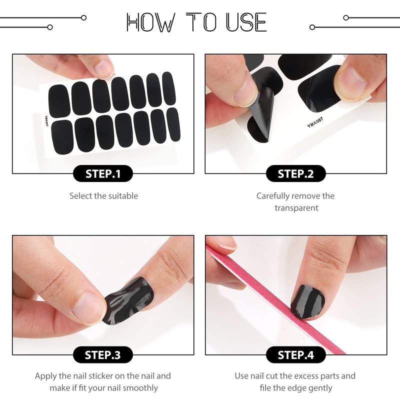 These nail stickers are self-adhesive, just keep your nails dry and clean, choose your favorite presentation, stick the nail stickers on your fingers, tear off the transparent film, press and smooth, you can paste the nails, use the nail file to repair the nails if you flatten it, you can get a beautiful nail style without hurting your own nails.