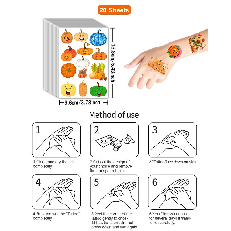- Easy to Use Pumpkin temporary tattoos, Cut out the desired motif,remove the plastic covering film of Pumpkin temporary tattoo,then stick the tattoo face down on the clean and tidy skin,wet the tattoo with water,gently pat and press for about 30 seconds,then tear off the paper