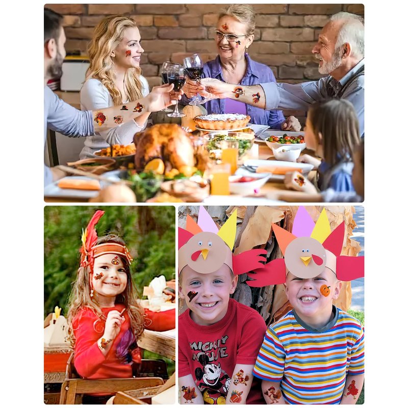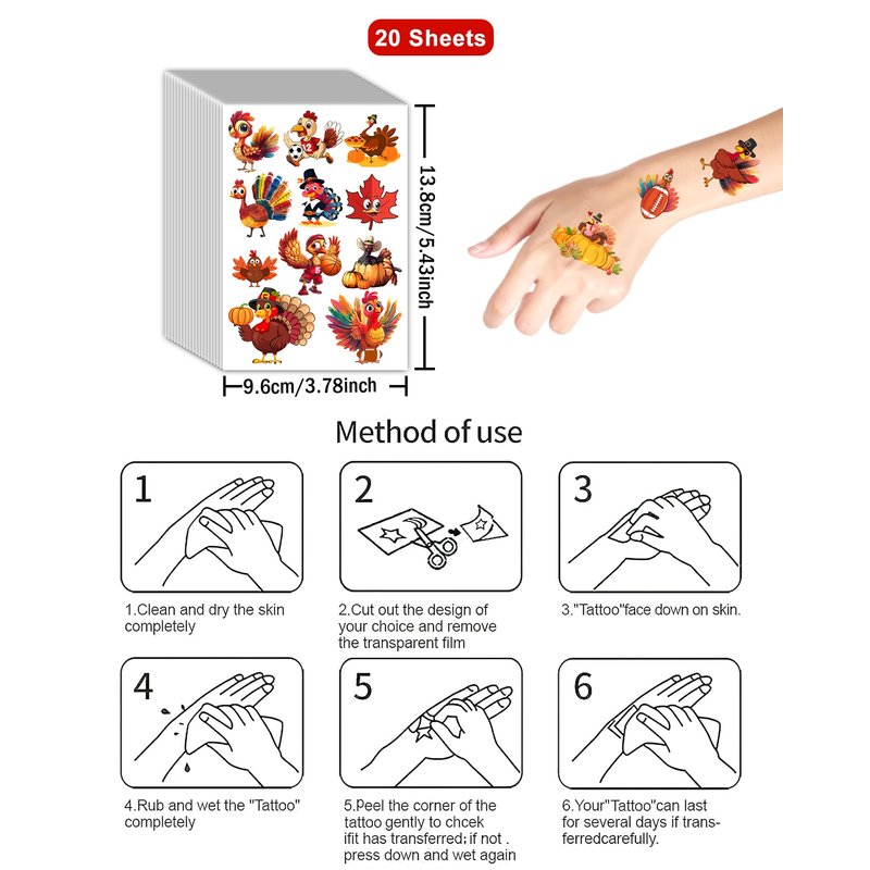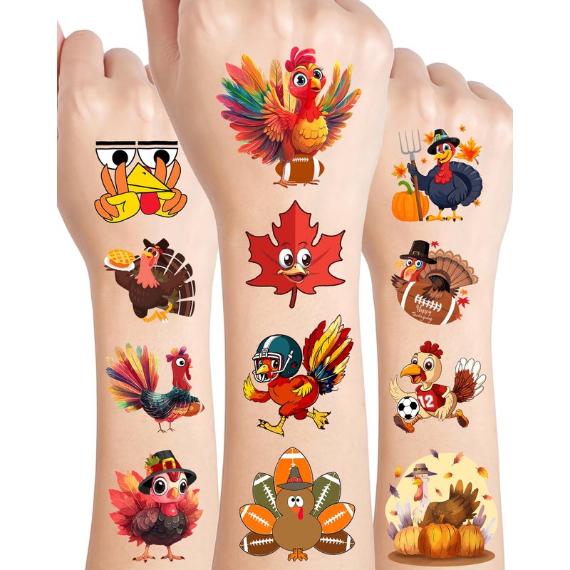 - Thanksgiving Turkey party decorations Package includes 220 pieces of Turkey themed temporary tattoos, which can be used wherever you want, such as arms, face, and hands