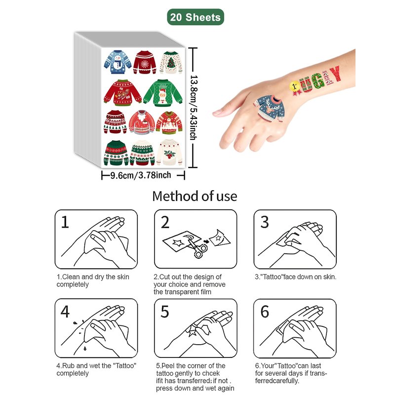 Quantity: 20 sheets Christmas Ugly Sweater temporary tattoos