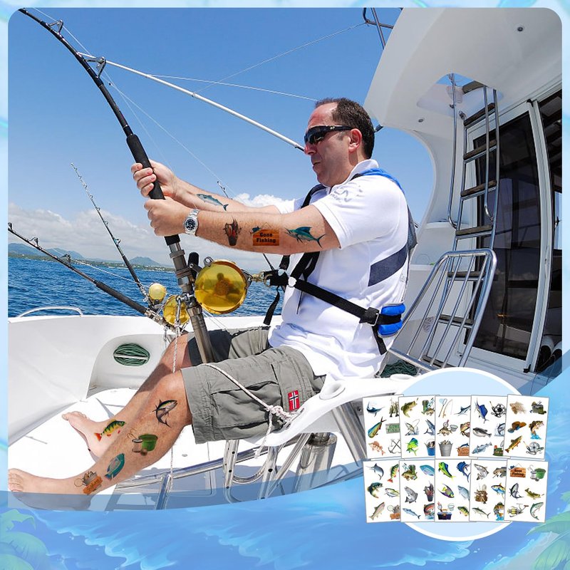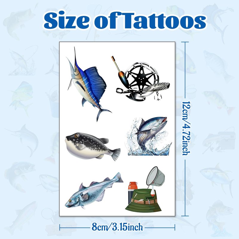 - 【Cute and Vivid Gone Fishing】: These gone fishin temporary tattoos features an assortment of fishing elements, such as fish jumping out of the water and realistic patterns of fishing nets, hooks, fish, fisherman hats. Adorable and eye catching, can serve well as a party decor ; The bright colors and exterior can easily attract people's attention.