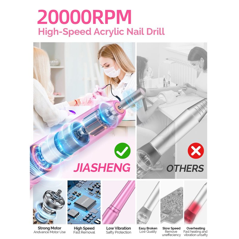 - Upgraded Performance: Our team has improved the electric nail drill machine. Equipped with a 20000rpm more powerful motor and shock-absorbing bearing, making it more durable, low vibration, low heat and low noise. Efficient for gel nails remover and making it an essential tool for nail enthusiasts and professionals alike