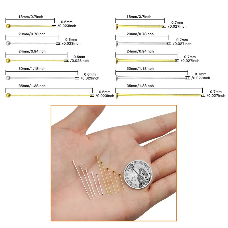 2000Pcs Assorted Head Pins Set for Jewelry Making,Jewelry Head Pins Kit Includes 1000Pcs Ball Head Pins 1000Pcs Flat Head Pins Eye Pins for Jewelry Finding,DIY Craft(Silver,Gold) Thanks for purchasing this Head Pins Set,this product is durable with long service life. Specifications: Material:flat pad pins : iron,ball pins:brass. Quality:2000Pcs in total Size: 18mm/0.7inch,20mm/0.78inch,24mm/0.94inch,30mm/1.18inch,35mm/1.38inch Color:Silver and gold Package includes: 1000xBall Head Pins 1000xFlat pad Head Pins