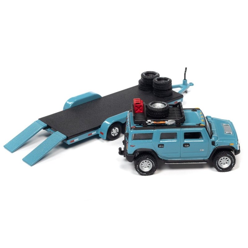 Brand new 1/64 scale diecast car model of 2004 H2 Ocean Blue with Open Trailer Limited Edition to 6012 pieces Worldwide "Truck and Trailer" Series die cast model car by Johnny Lightning JLBT014-JLSP202B