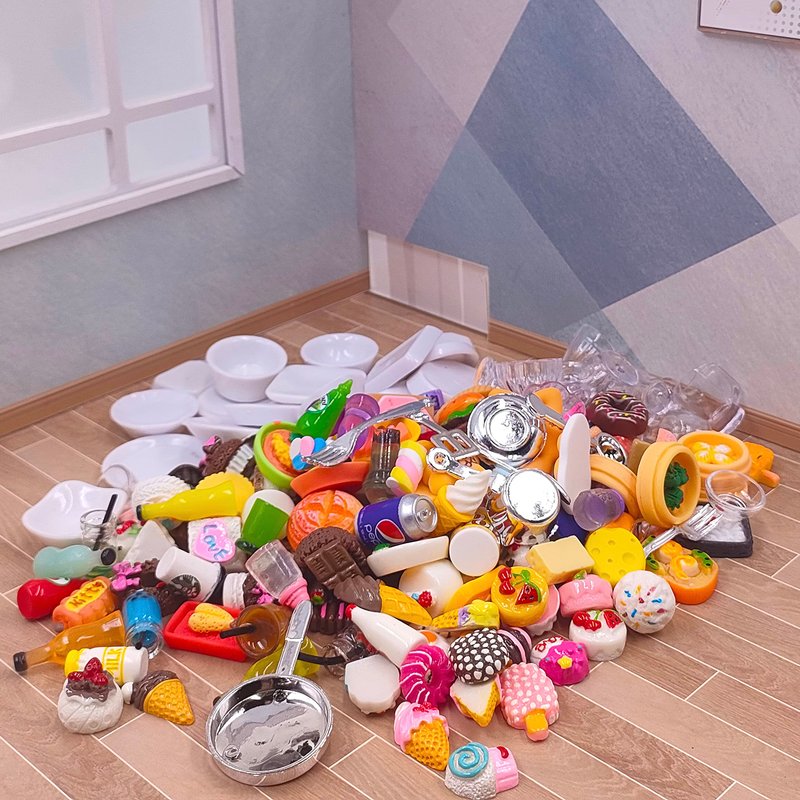 - SUPER VALUE ——200pcs miniature food toys set come with different style mini food, nclude: food, beverage bottles, beverage cans, burgers, French fries, cakes, milk tea, bread, chocolate, ice cream, milk, beverages , kitchenware, tableware and more. Enough quantity and style offers you starting pretend food play,help to relieve stress, develop creativity and imagination, bringing you lots of fun.