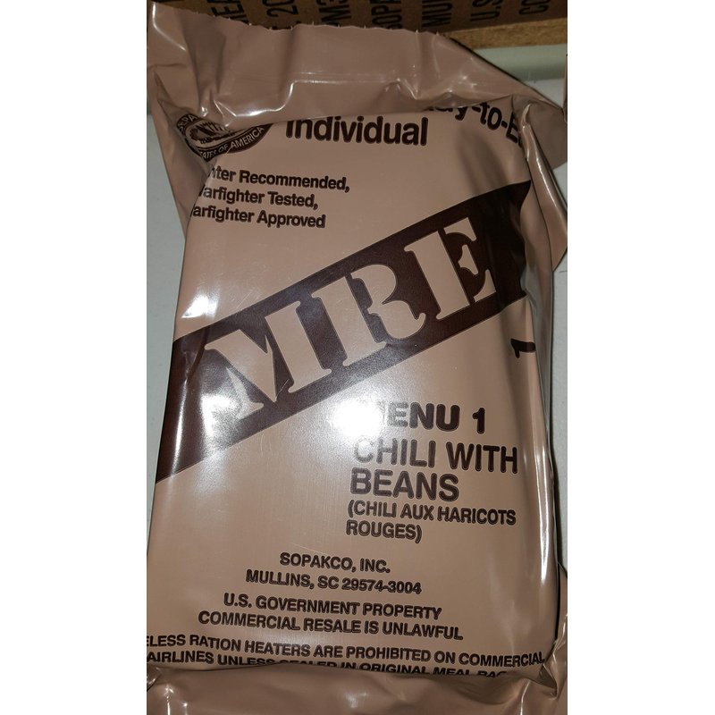 - Single meal 2021+ Chili With Beans Military issue MRE that is perfect for Hiking, Camping, and Emergencies