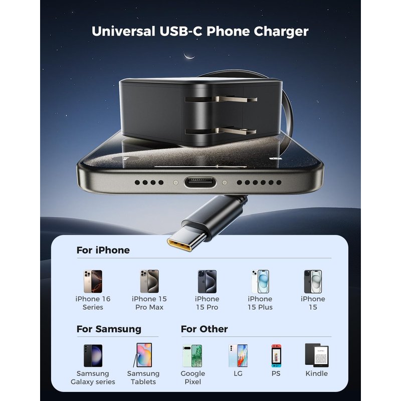 - 🍃Foldable, Portable Design - Our charger features the latest upgraded foldable plug and retractable charging cable design, making your travel more convenient. Simply fold the plug, retract the charging cable, and put it in your bag or pocket when you're on the go. Protect your favorite mobile phones and tablets from annoying scratches and keep your space clutter-free.