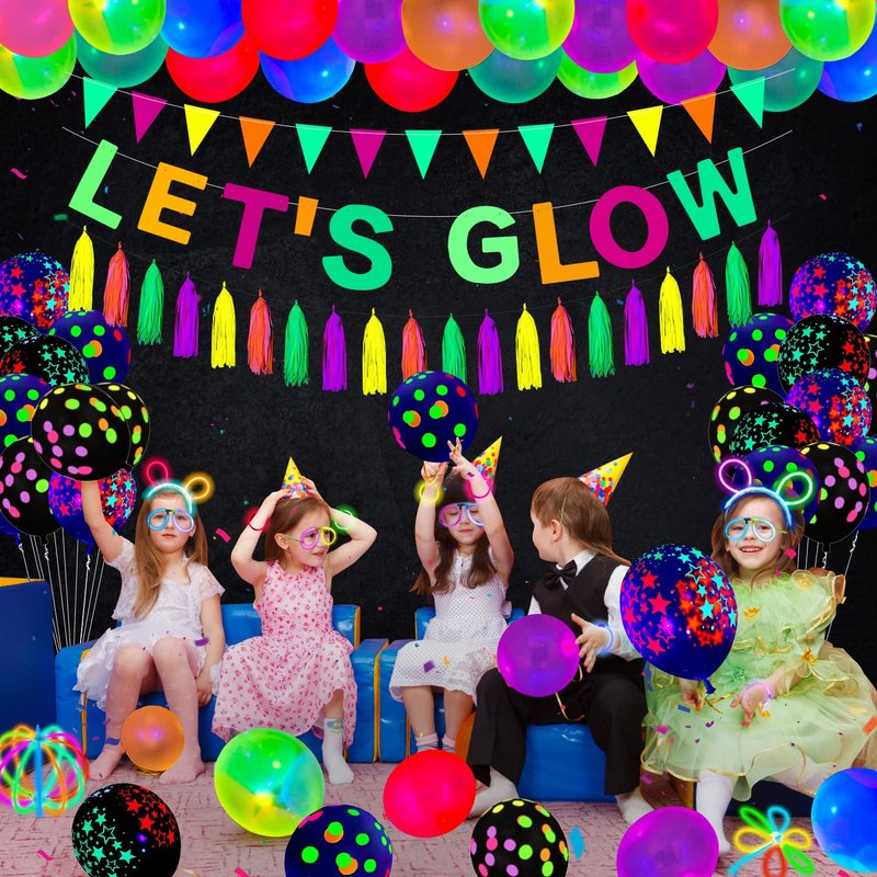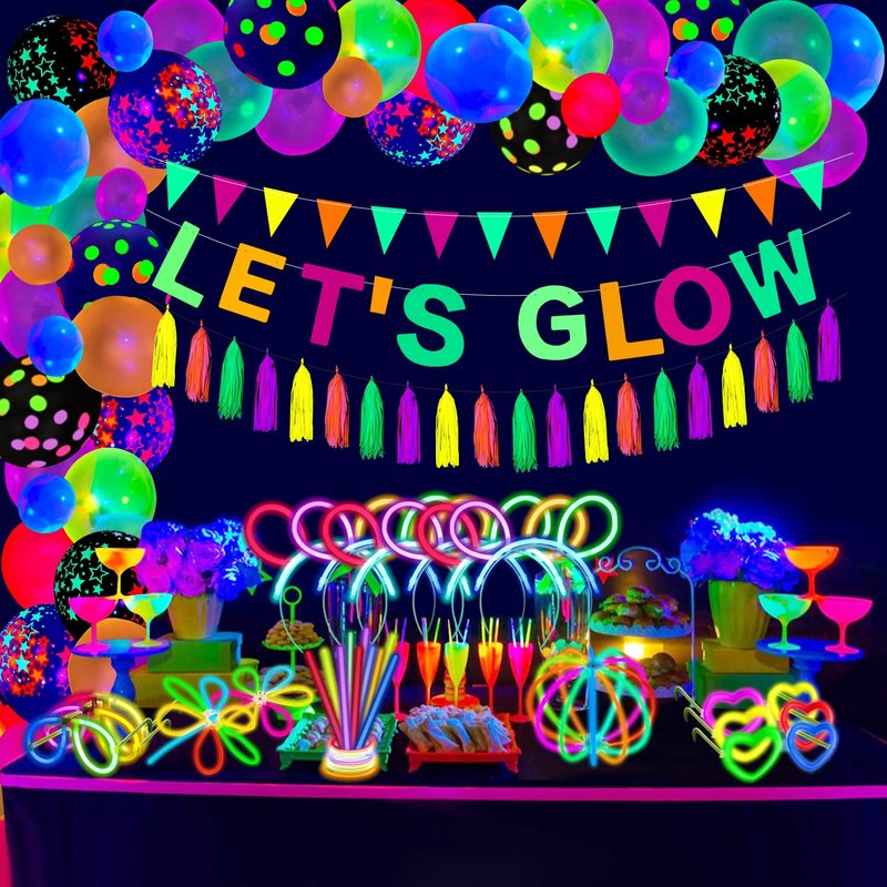 - 🎁Package Includes: 60 x 8" Glow Sticks, 30 x 10" mixed colored glow balloons, 20 x 12" latex glow balloons (5 black star, 5 black polka dot; 5 transparent star, 5 black star), 8 x hollow stars, 1 x LET’S GLOW banner, 1 x neon triangle flags, 50 x stick connectors, 20 x neon paper tassels, 6 x glasses connectors(3 heart, 3 circle), 6 x headband connectors, 2 x flower connectors, 2 black ribbons, 1 x ball connector, 1 x glue dot, 1 x balloon chain.