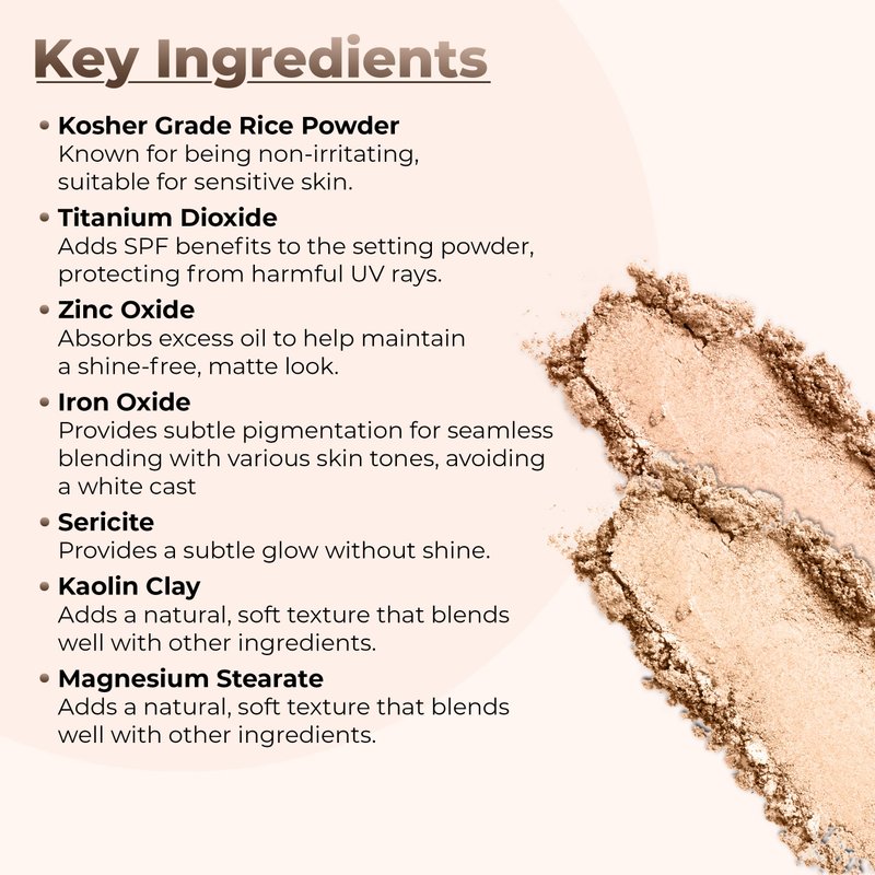 INGREDIENTS: KOSHER GRADE RICE, TITANIUM DIOXIDE, ZINC, IRON OXIDE, SERICITE, KAOLIN CLAY, MAGNESIUM STEARATE Rice Powder blends perfectly with your regular mineral foundation powder to create an amazing long-lasting matte finish on your skin.