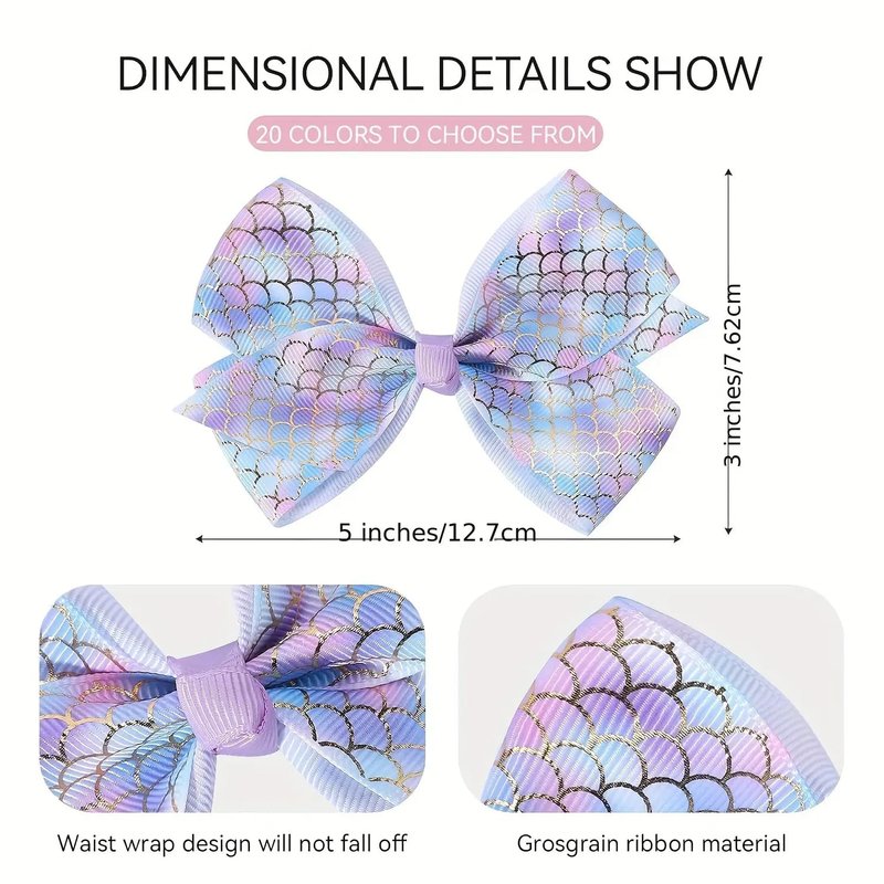 - SET OF 20 CUTE & STYLISH HAIR BOWS-20PCS hairbows clips of rainbow/heart/flower/mermaid patterns included to match any of your sweet girls' outfit everyday.The assortment of beautiful girl hair accessories hair bows for little girls are colorful,attached by durable metal clips,Alligator clip bows can be clipped in your hair with the featured clip backing whatever how thin or thick your hair is.These boutique handmade girls hair bows will make your little girls'every day dressing more charming.