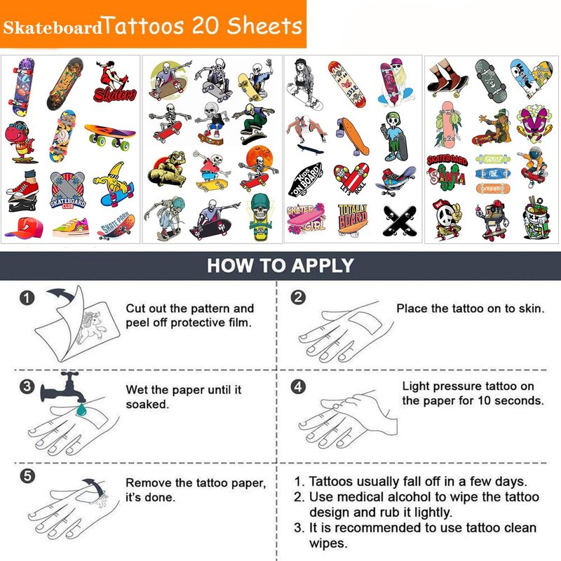 - Skateboard Temporary Tattoos - You will get 20 sheets of skateboarding tattoos in 4 styles, 5 sheets for each style; The quantity and styles are enough to meet your needs and replacement of decorations
