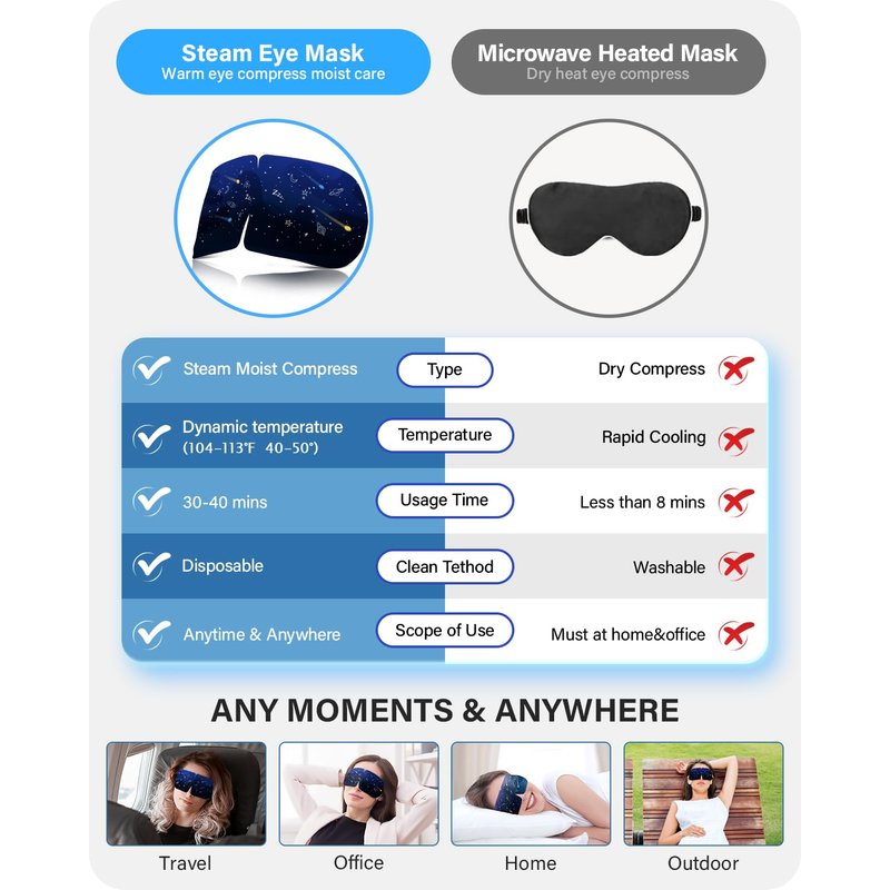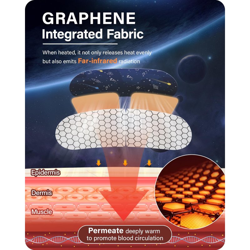 - ðãUpgraded Graphene Steam Eye MaskãOur heated eye mask is added with a graphene contact layer, which releases far-infrared microwaves during the hot compress, promotes blood circulation around the eyes. Steam Warm Eye Masks can relieve your eye fatigue,moisturize your eyes, improve your sleep quality, reduce dry puffy eyes and dark circles.