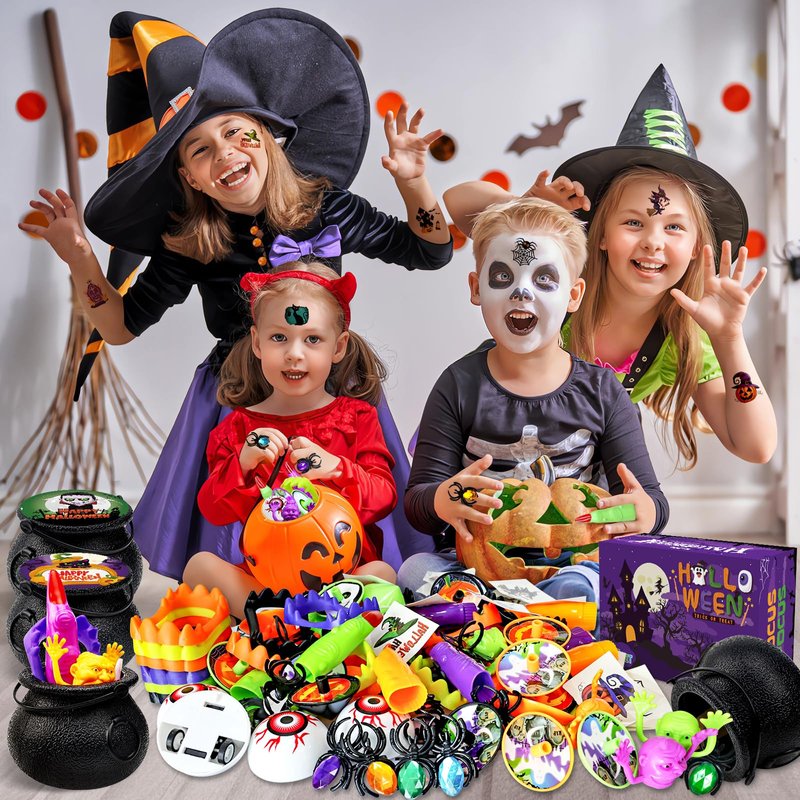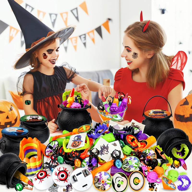 - [216PCS Party Favors & 7 Various Toys] 7 different party favors prefilled in the plastic witch cauldrons.216 pieces of party favors are included in the box! The elegant box is designed to be shared as a present to kids.All of Halloween toys are ready prefilled for a Halloween gifts