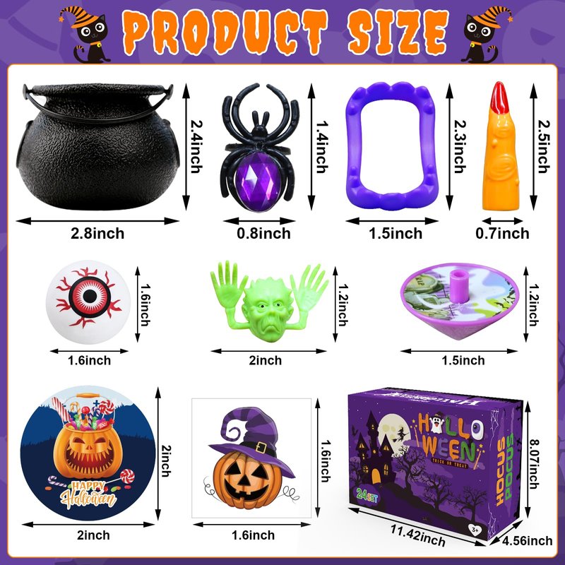 - [Packge Included] Halloween party favor for kids includes small witch cauldrons 24pcs, Halloween stickers 24pcs, colorful witch fingers 24pcs, vampire teeth 24pcs, Halloween spinner tops 24pcs, pull back cars 24pcs, spider rings 24pcs, ghost finger covers 24pcs, Halloween tattoos 24pcs. All miniatures toys are carefully selected and kids will have a super surprise when open