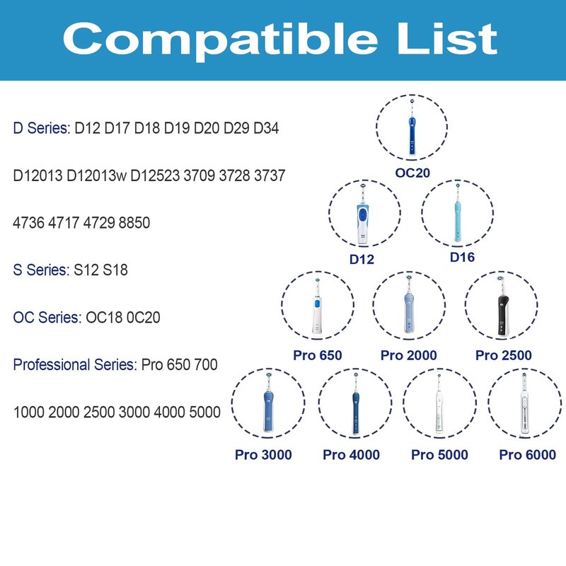 [Wide Compatibility] Commonly used in Braun Oral-B electric toothbrush models: D12 S12 S18 D10 D16 D17 D18 D19 D20 D29 D34 D36 / OC18 OC20 / D12013 D12013w D12523 series / Professional 500 600 1000 2000 2500 3000 4000 5000 7000 7500 3709 3728 3737 3756 4736 4717 4729 4733 6500 8000 8850 8900 9000 9000s Genius 6000 8000 et. Suitable for all Oral-B Round head electric toothbrush.