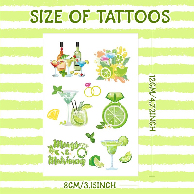 - Package Includes: Get 24 sheets of margs and matrimony temporary tattoo stickers, totaling 224 unique designs featuring lemon cocktails. Each sheet measures 12 x 8 cm (4.72 x 3.15 inches), providing ample quantity for decorating various places at your martini themed bachelorette party