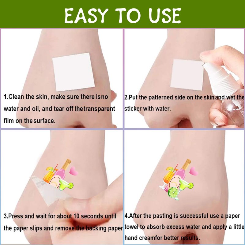 - How to Use: Simply cut out the desired tattoo, place it on clean skin or flat surfaces, and wet thoroughly with water for 20 30 seconds. Peel off the backing paper to reveal your temporary tattoo