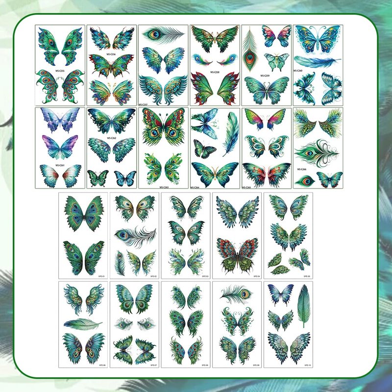 - Package: The fake peacock butterfly temporary tattoos has 22 sheets different butterfly wings patterns
