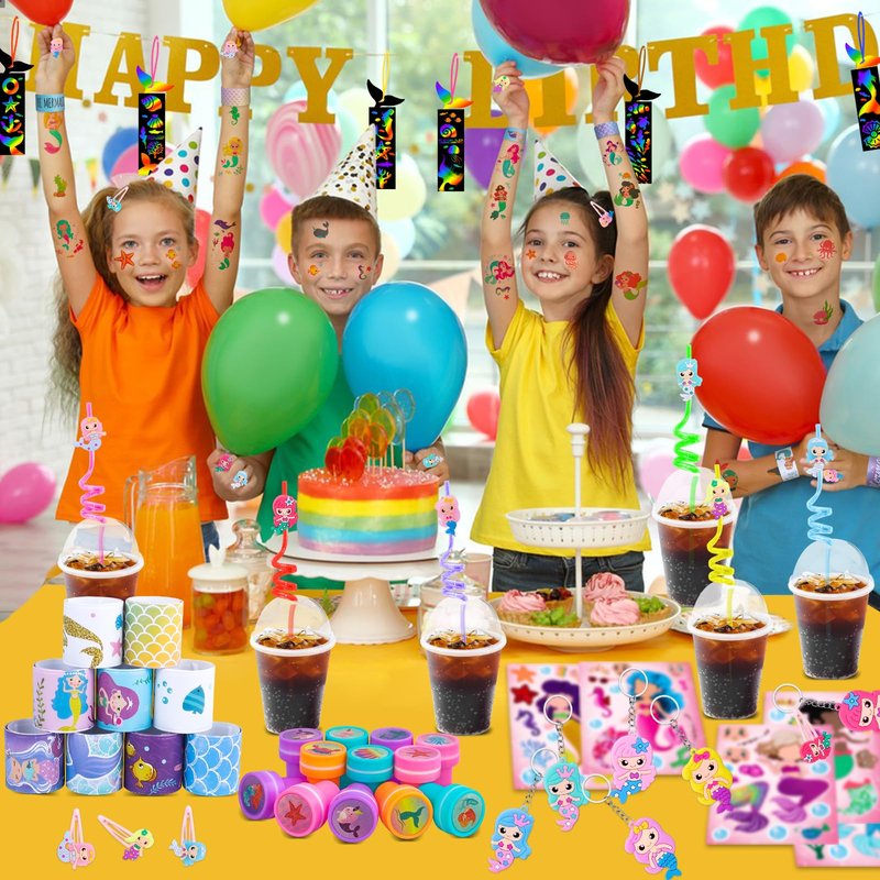 - Mermaid Party Supplies - Included 12pcs cups with lids, 12pcs Mermaid straws, 12pcs Mermaid rings, 12pcs Mermaid keychains, 12pcs Mermaid hair clips, 12pcs Mermaid hair rings, 12pcs Mermaid slap bracelets, 12pcs Mermaid stampers, 12 Sheet Tattoo, 100pcs Stickers, 12pcs face stickers, 12pcs Mermaid scratch art, and 100pcs sticker, sufficient quantity for kids birthday party favors.