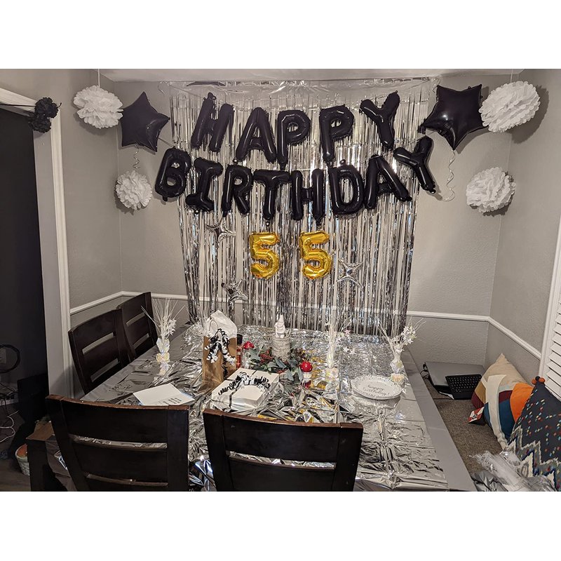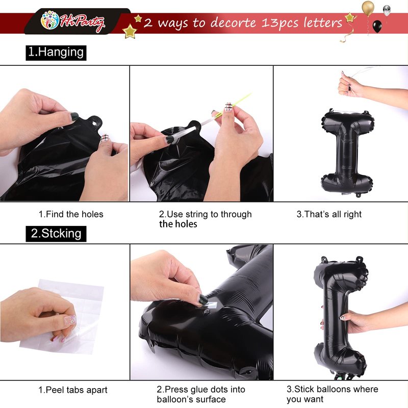 - 🍰【Valuable pack】①Happy Birthday letters x13pcs(16in) ②Big black star balloon x2pcs(18in) ③Silver color star balloons(10in)x3pcs ④1pc 10m(33ft) Ribbon and 1pc Plastic Needle ⑤Plastic straw x1pcs (4.0in) ⑥Double-sided glue dot (20dot) ⑦HiParty Customer Service Card