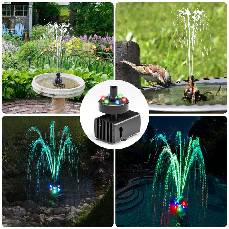 - 6 Colorful LED Lights Water Fountain Pump: The fountain pump is equipped with 6 high-brightness LED lights, so that your garden can become colorful during the day and night; The RGB color automatic cycle setting makes the night in your yard more romantic and beautiful; And with 7 nozzles, there are 7 different fountain modes, you can easily disassemble and replace