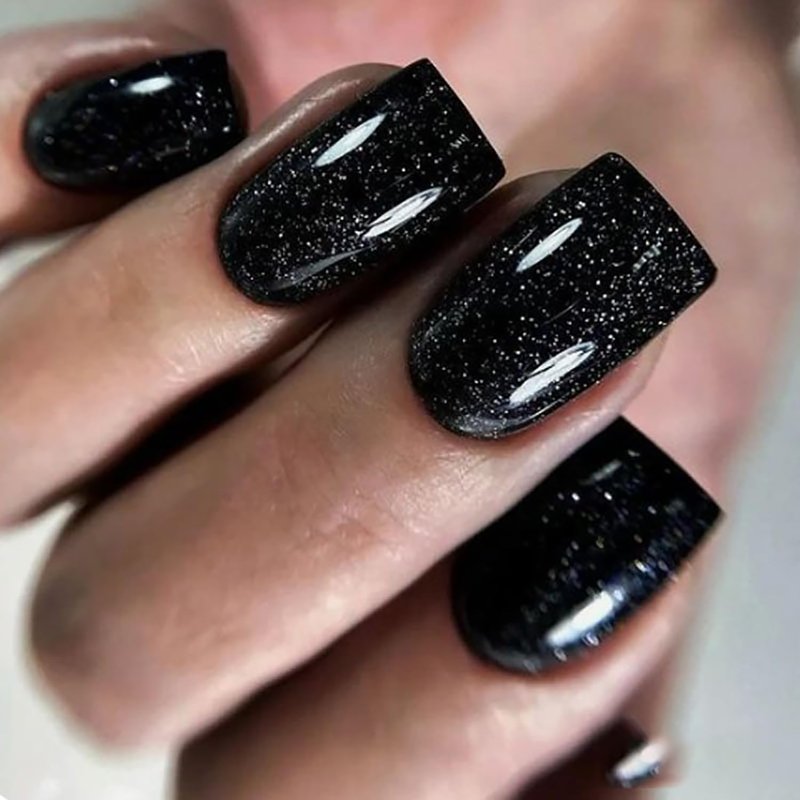 24 Pcs Black Press on Nails Square Glitter Fake Nails Glossy Glue on Nails with Nail Glue Natural Full Cover False Nail Tips Medium Stick on Nails Artificial Finger Manicure for Women Girls