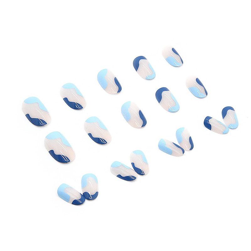 24Pcs Blue Press on Nails Short with Stripe Wave Design Fake Nails Set for Women Manicure Decorations