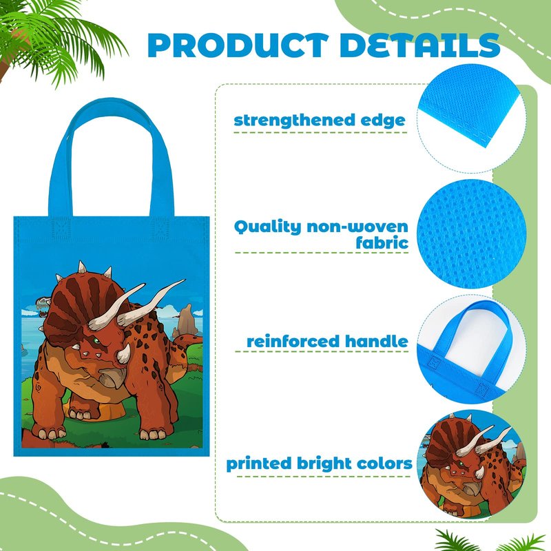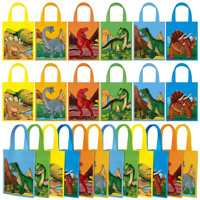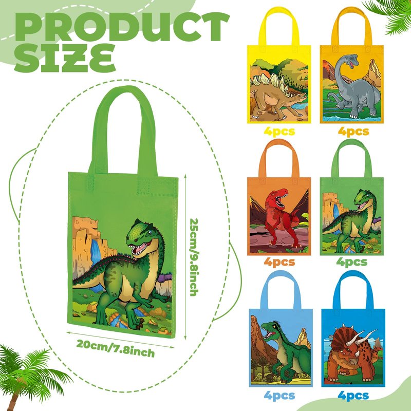 Features: Dinosaur tote bag makes an ideal gift for kids, designed with dinosaur and vibrant colors, can be applied as classroom reward to brighten up your event. Our non woven dinosaur birthday gift bags for kids are cute enough to match many different kids party themes and reliable enough to hold toys, candy and other gifts. Specifications: Material: non wovenColor: as shownSize: about 7.87 x 9.84 inches/ 20 x 25 cmPackage includes: 24 x Dinosaur party favor bagsNotes: Manual measurement, please allow slight errors on size. The color may exist a slight difference due to different screen displays.