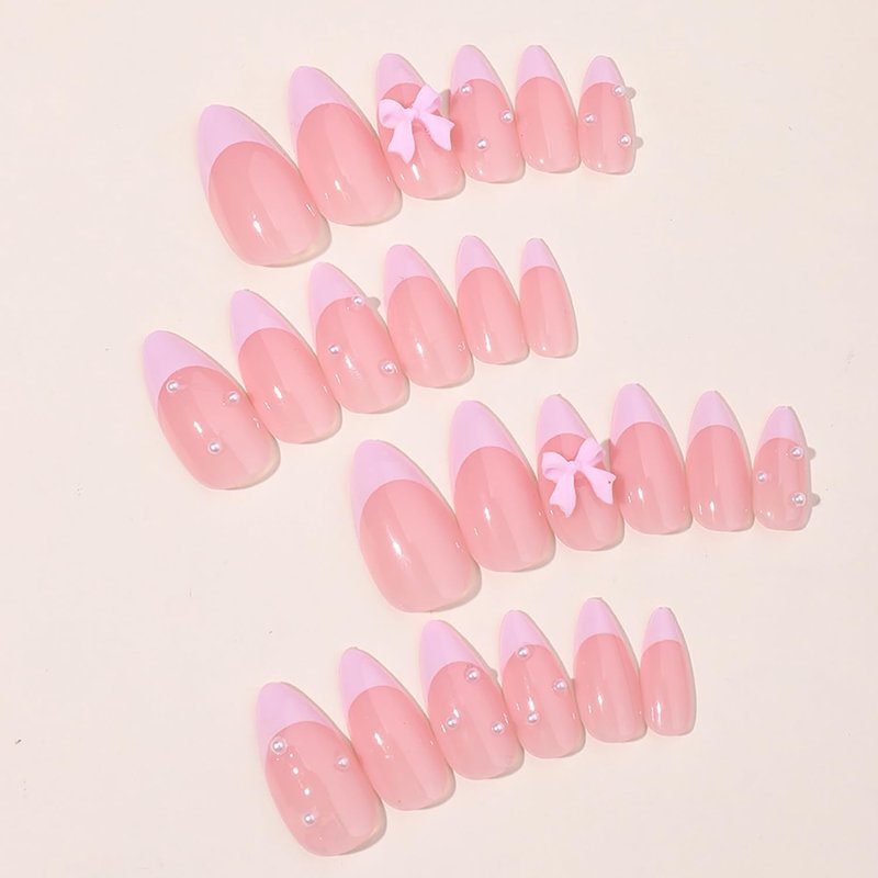 24 Pcs French Tip Press on Nails Cute Acrylic Fake Nails with 3D Bow Pearl Nude Pink Full Cover False Nails with Glue Almond Nail Tips Glossy Glue on Nails Artificial Stick on Nails for Women Girls