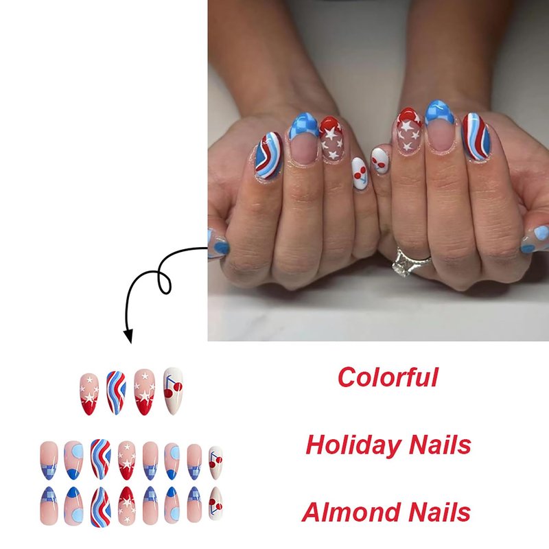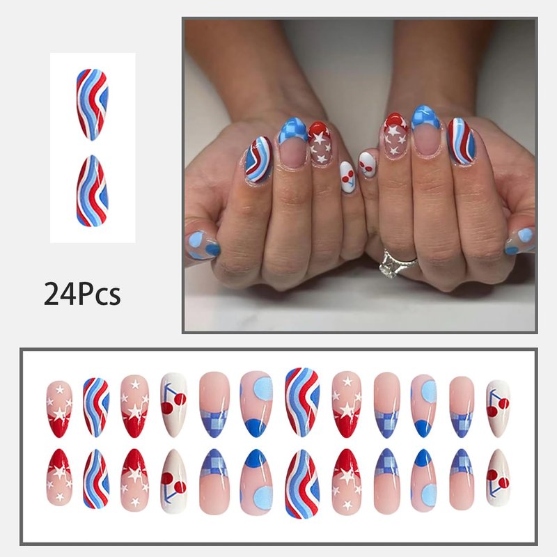 24 Pcs French Tip Press on Nails Medium Almond Fake Nails 4th of July False Nails with Star Cherry Pattern Design Gel Nails Press ons Patriotic Nails Acrylic Glue on Nails Artificial Nails for Women