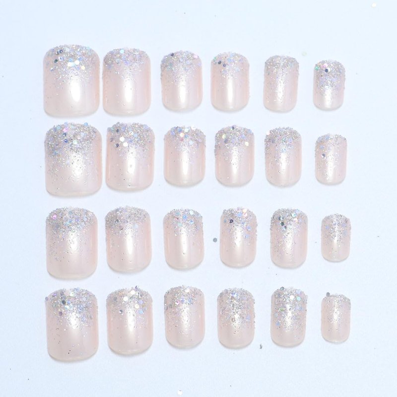 24 Pcs Glitter French Press on Nails Short Square - WLGDLH Nude Fake Nails Spring Summer False Nails with Cute Silver Glitter Designs Nail Tips Full Cover Stick on Nails for Women Acrylic Nails