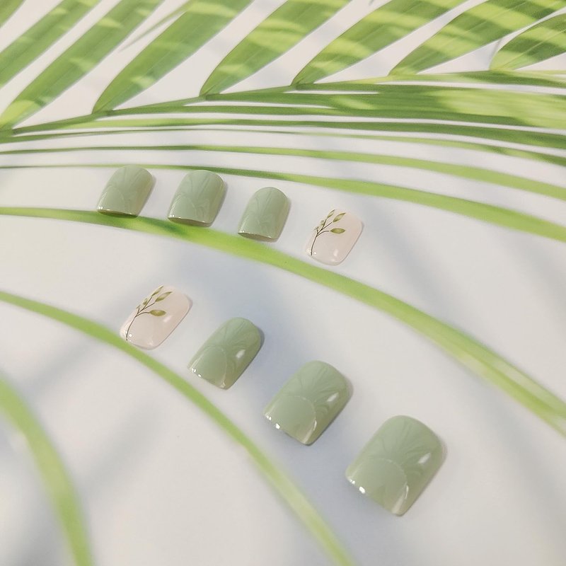 24 Pcs Green Square Press on Nails Short Fake Nails with Glue Glossy Acrylic Glue on Nails Spring Summer False Nails with Leaves Designs Full Nail Tips Reusable Stick on Nails for Women Girls