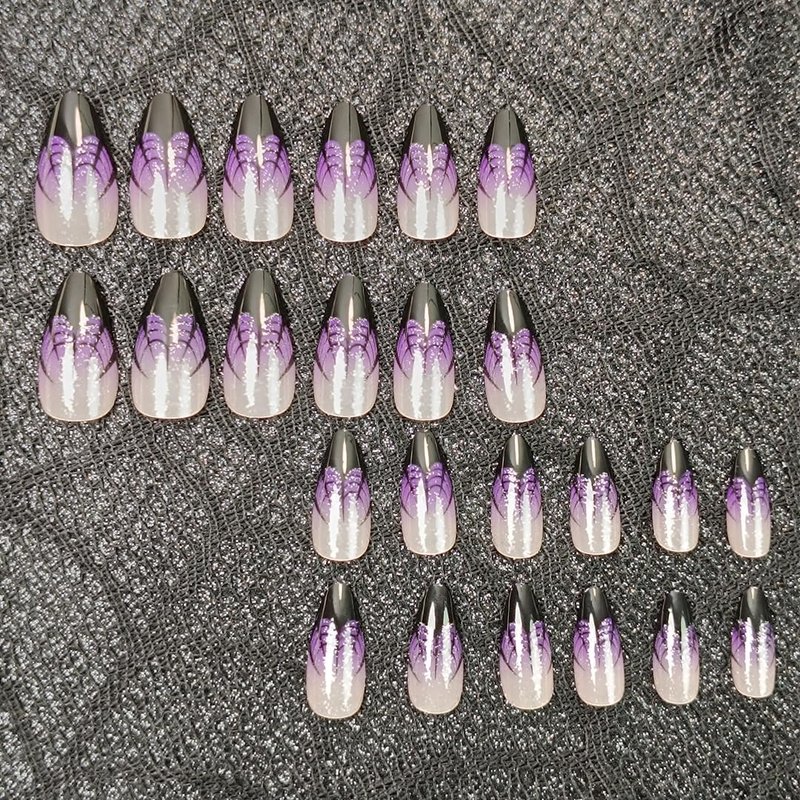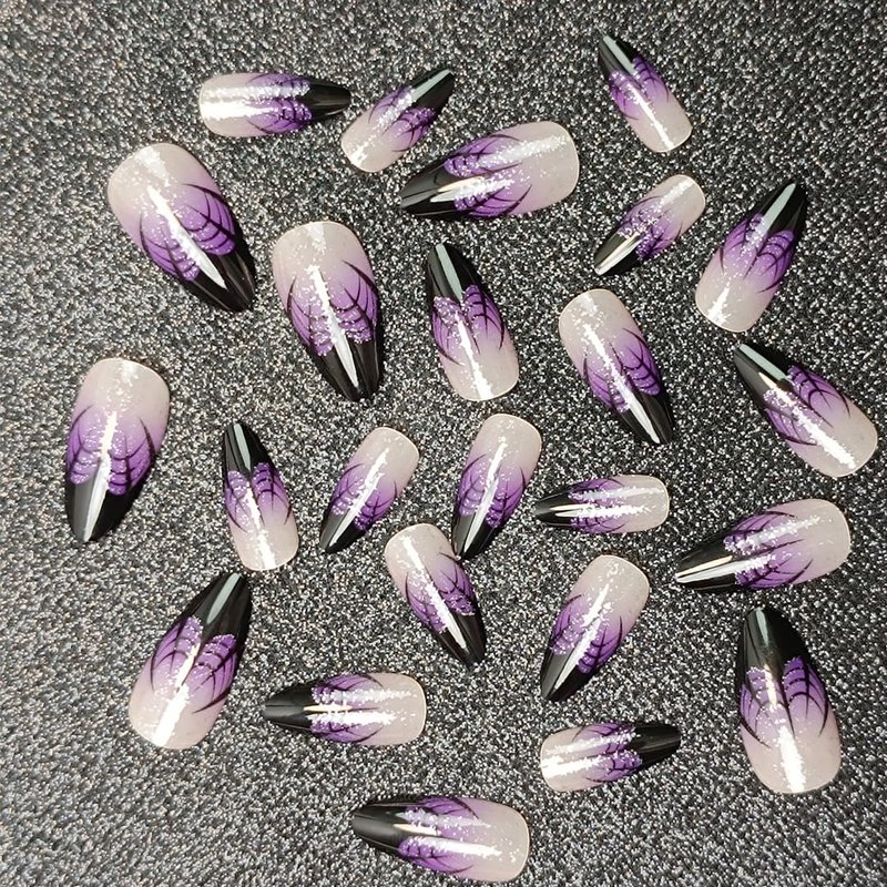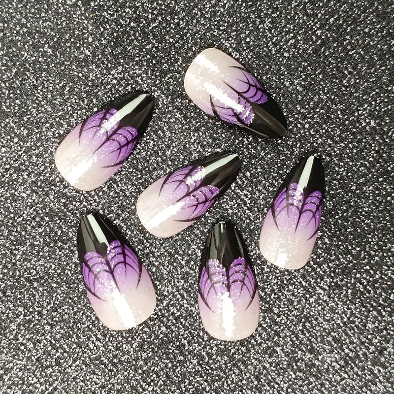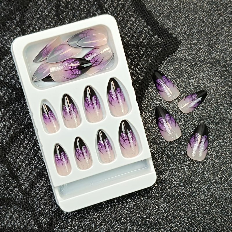 24 Pcs Halloween Pink Almond Short Press on Nails - SHANRUN Black Spider Web French Fake Nails Press ons Nail Art Tips Glue on Nails Full Cover Acrylic Stick False Nails with Ombre Purple Design Women